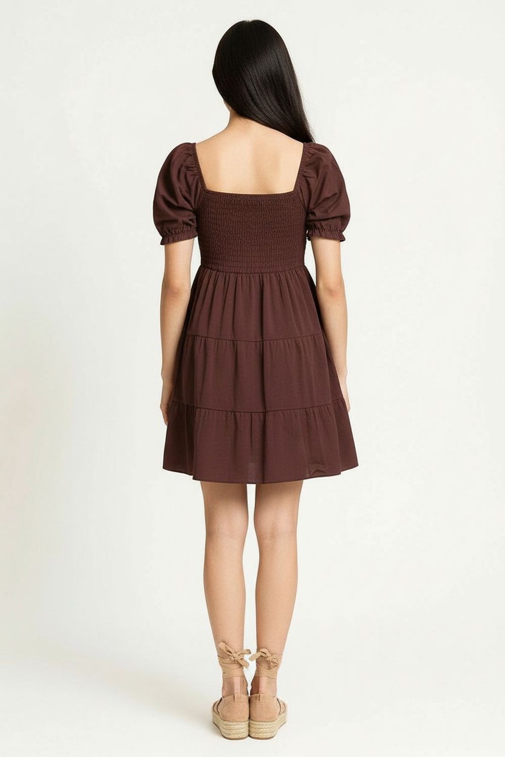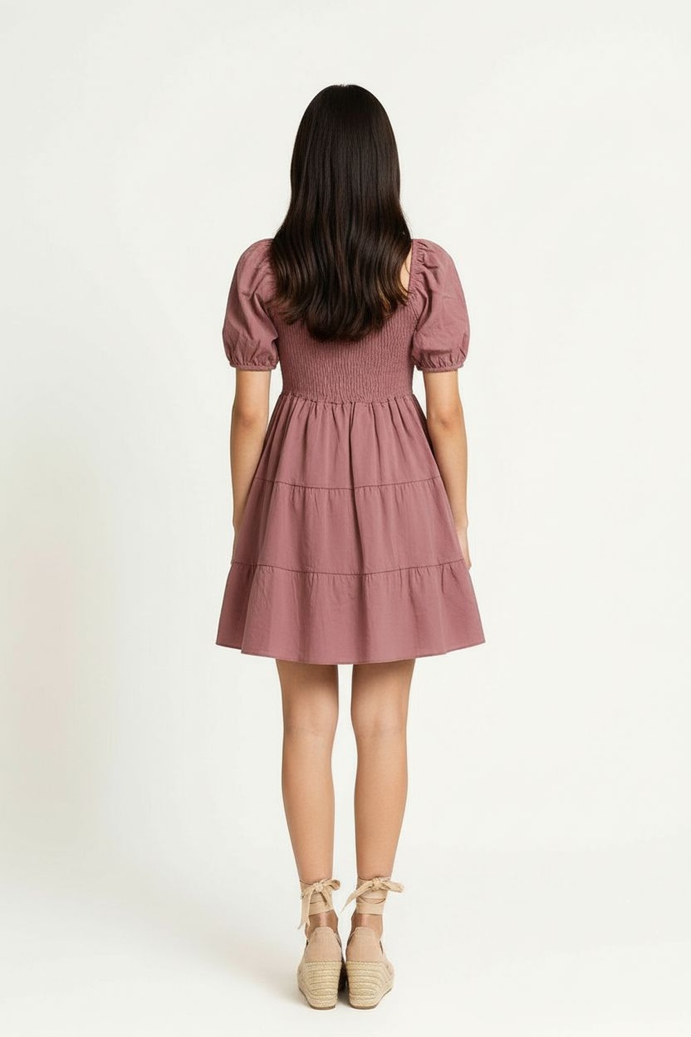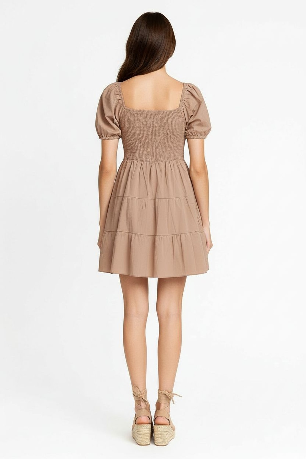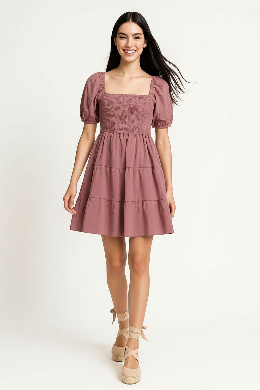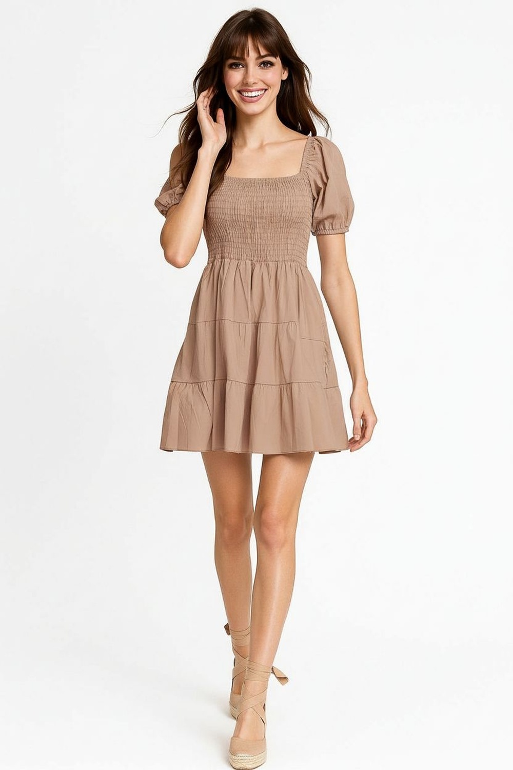Vestido corto con corte campirano y parte superior fruncida tipo nido de abeja que se ajusta al cuerpo, mangas abullonadas con puño elástico que aportan volumen, falda con vuelos amplios que ofrecen fluidez y ligereza