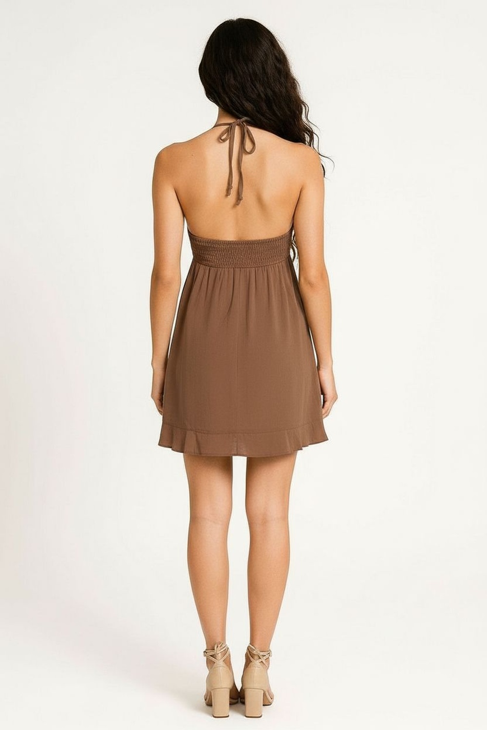 Vestido corto de tirantes delgados con escote frontal estructurado, espalda abierta con amarre ajustable que permite adaptación al cuerpo, cintura con sección elástica integrada que brinda ajuste cómodo, falda de caída ligera con movimiento natural, confección en tejido suave que aporta frescura y comodidad