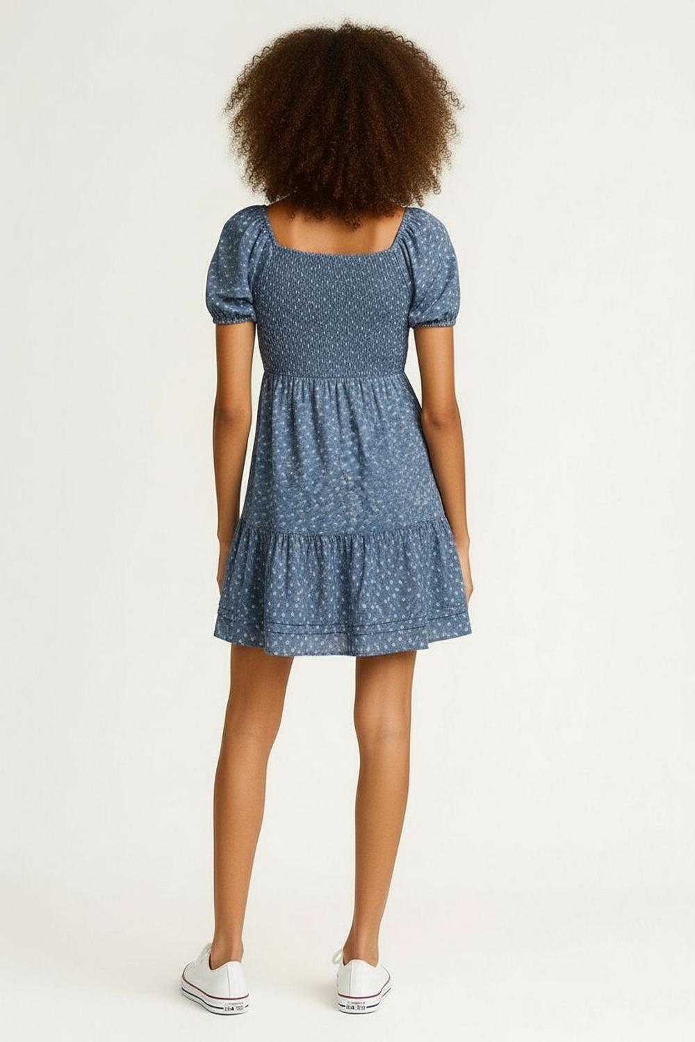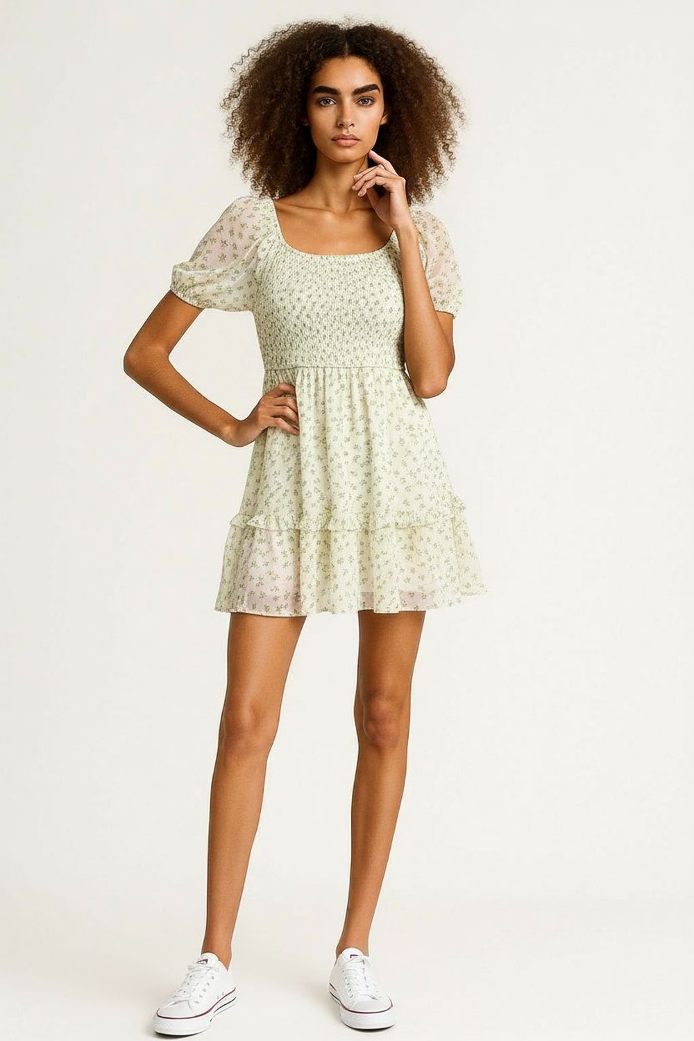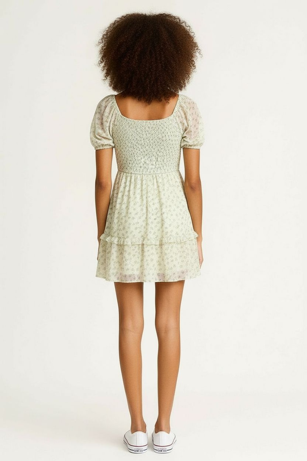 Vestido corto con escote amplio y elástico que permite ajuste cómodo, mangas cortas con volumen suave que aportan estructura, cuerpo superior con fruncido elástico que define la silueta, corte bajo busto que brinda caída ligera, falda con largo arriba de la rodilla y terminación fluida, confección ligera con movimiento natural