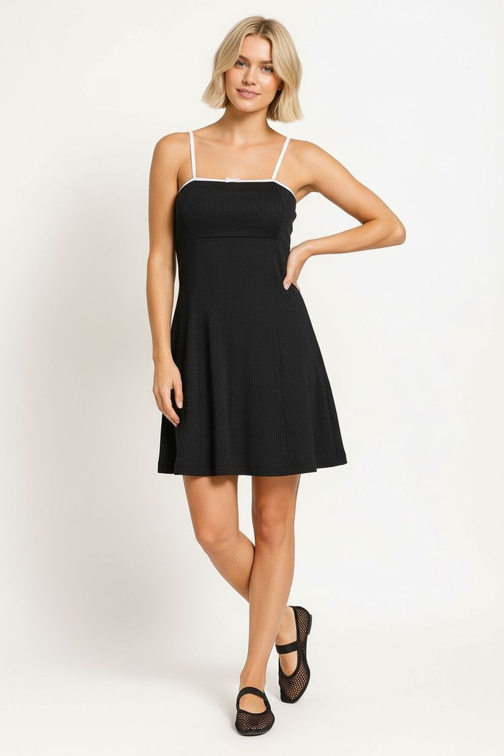 Vestido corto de tirantes delgados que aporta frescura y comodidad, escote recto que realza la silueta con un diseño limpio y favorecedor, confección en tejido rib elástico que se adapta al cuerpo definiendo la figura, falda con caída ligera que brinda movimiento natural y estilo juvenil, ideal para looks casuales o combinaciones versátiles de temporada