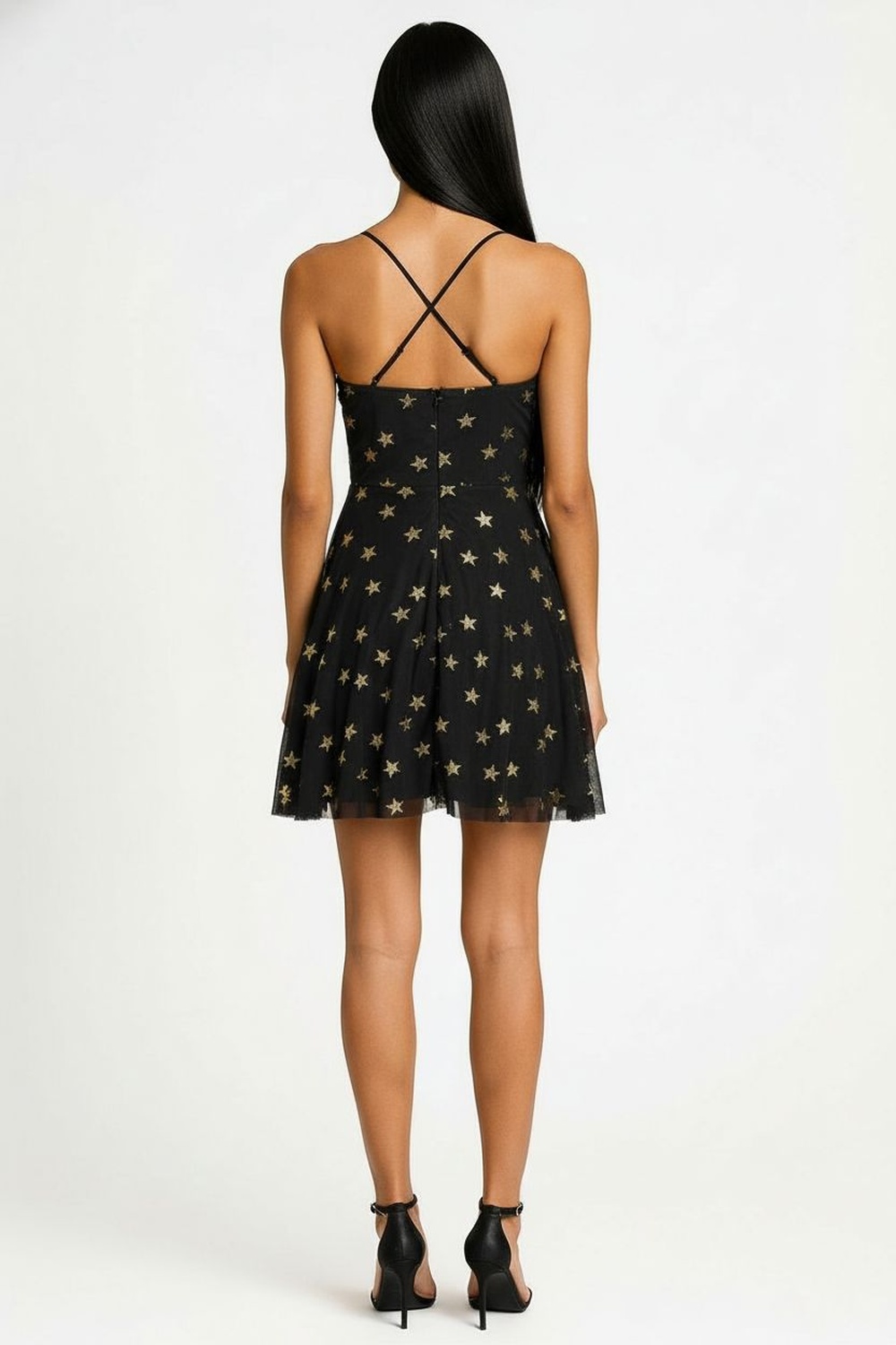Vestido corto con tirantes delgados cruzados en espalda que brindan sujeción, busto estructurado que realza la forma, falda amplia de caída fluida que genera movimiento, cierre posterior oculto que facilita el ajuste, confección ligera de tacto suave