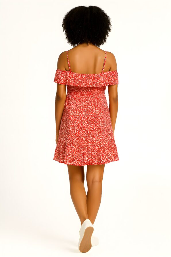 Vestido corto tipo challis con tirantes delgados y hombros descubiertos que enmarcan delicadamente la parte superior, detalle de smock en escote que proporciona ajuste cómodo y favorecedor, olanes en escote y bajo que aportan movimiento y feminidad, estampado floral vibrante ideal para días soleados, picnics o paseos casuales, prenda ligera que fusiona estilo romántico con frescura veraniega