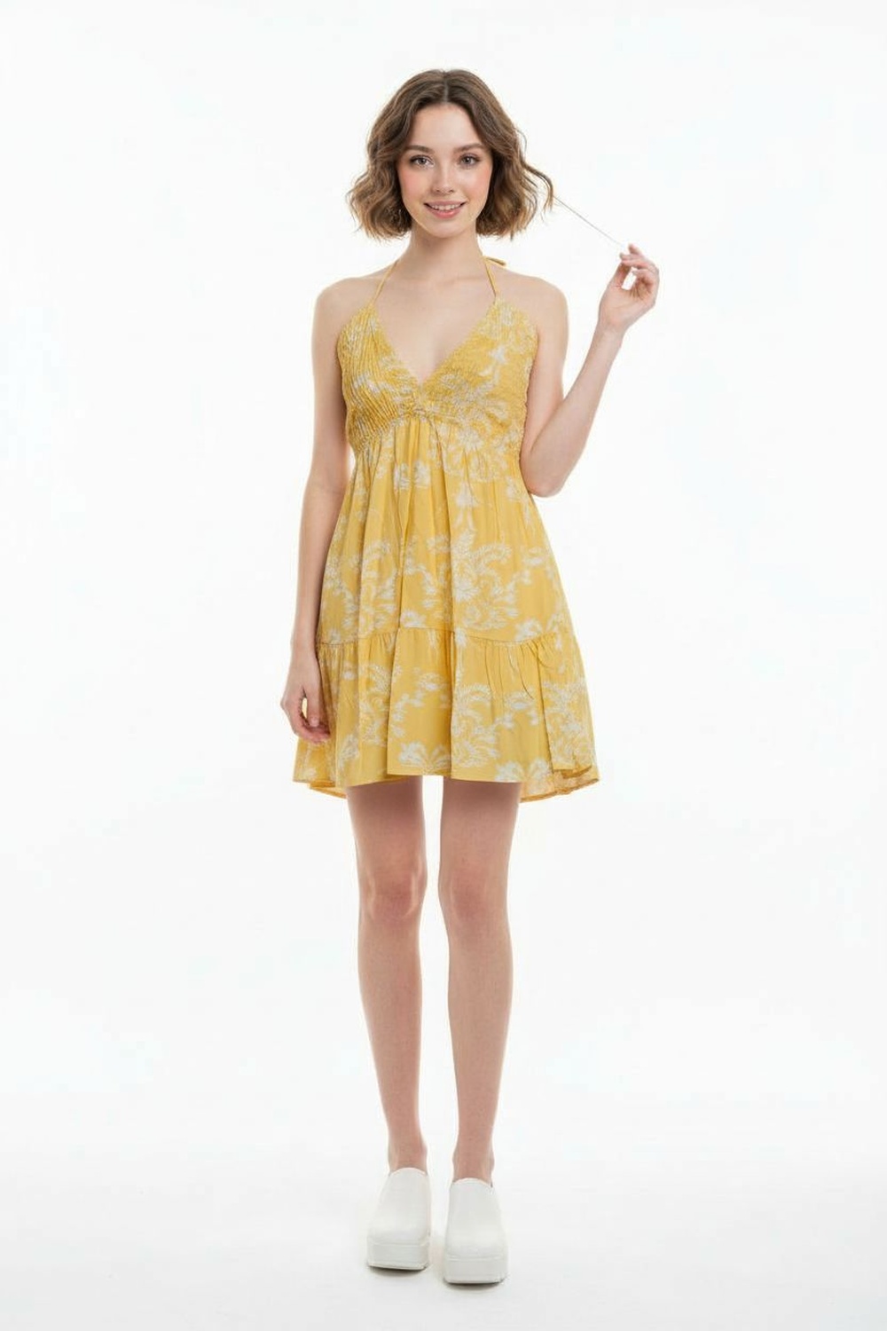 Blusa tipo halter con tirantes para amarre en hombros, escote cruzado, corte debajo del busto, caída ligera con volumen, estructura suave y ajuste cómodo