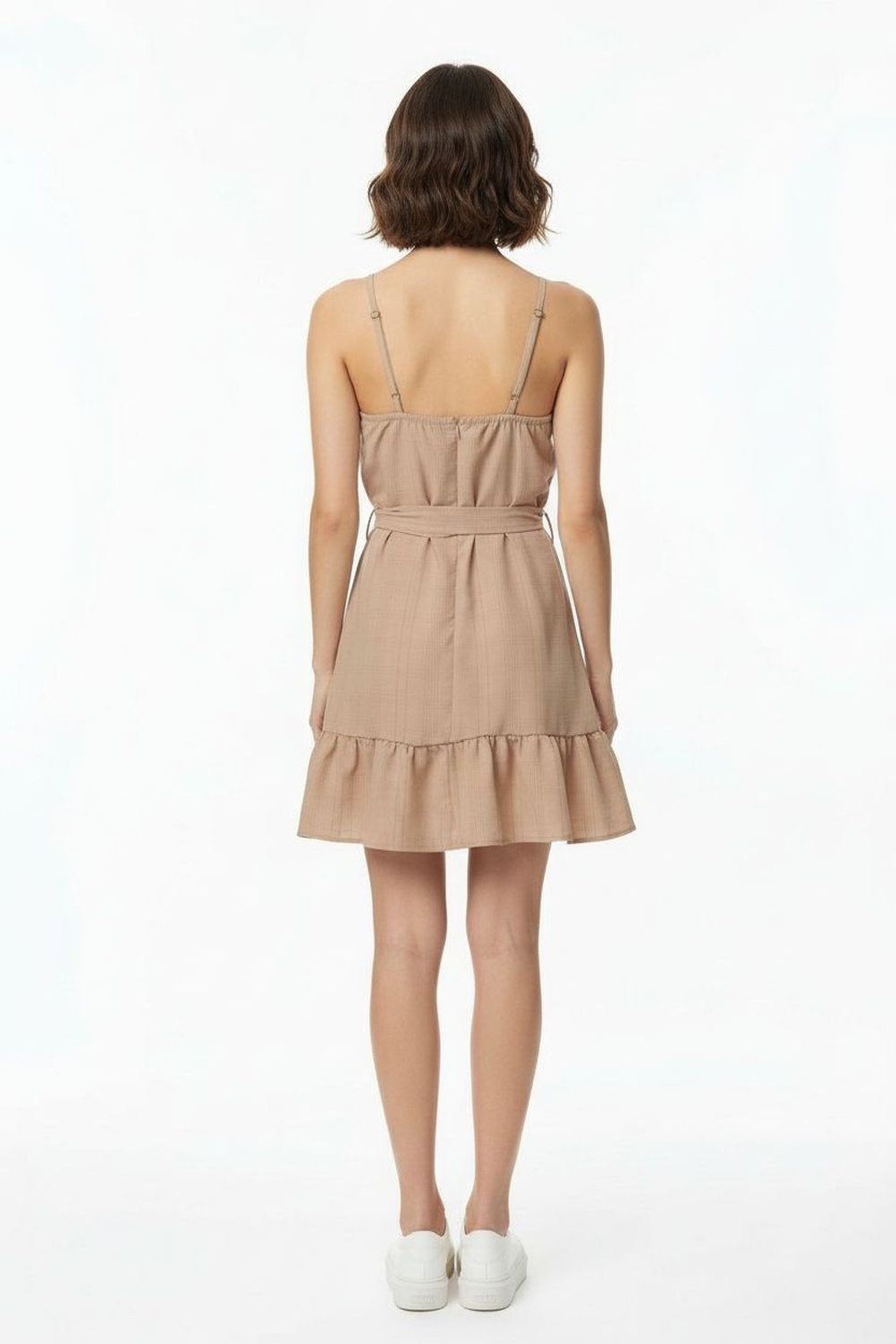 Vestido halter con escote alto y ajuste en cuello, silueta fluida, cintura con lazo integrado, faldón con ligero volumen, acabado suave