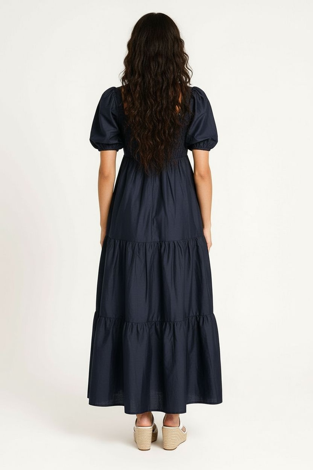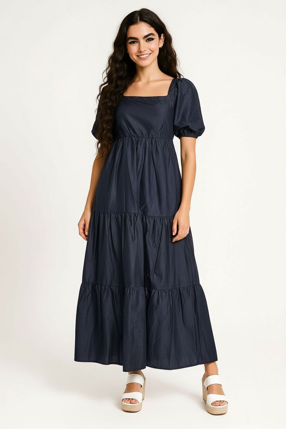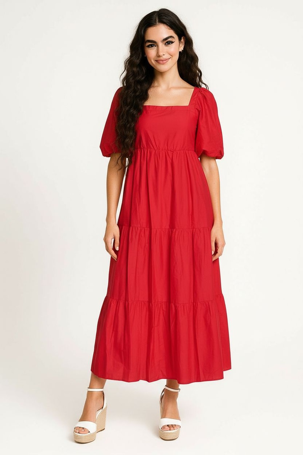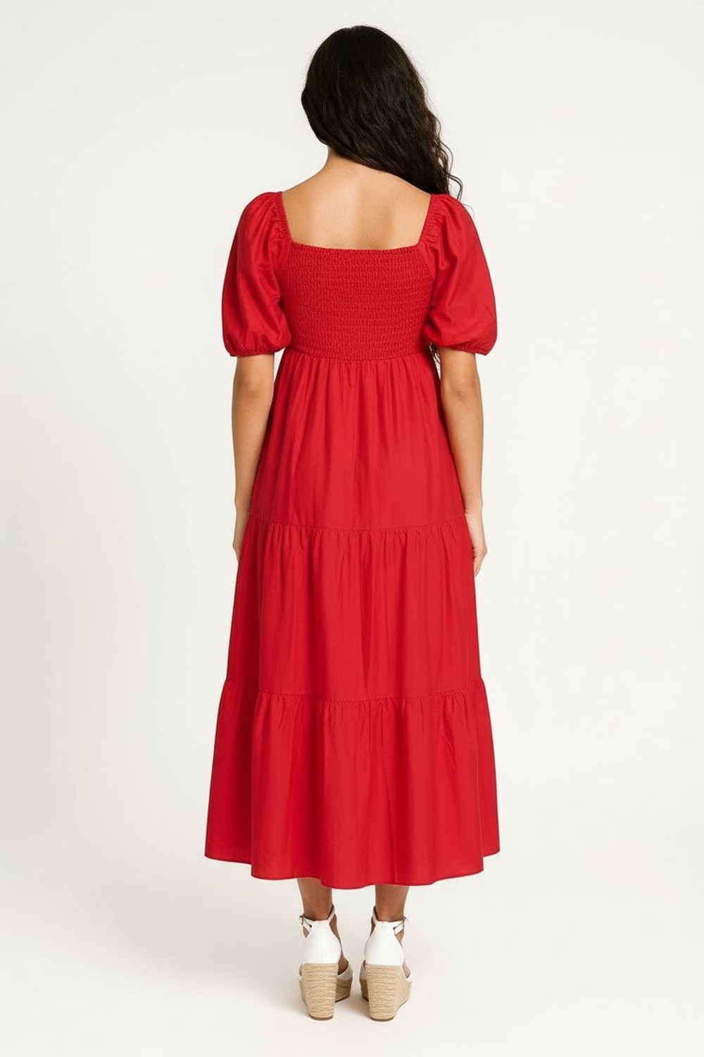 Vestido midi con escote cuadrado y manga globo de volumen sutil, corte debajo del busto que define la silueta, falda amplia con paneles fruncidos que aportan movimiento, espalda con resorte tipo smock que mejora el ajuste al cuerpo, confección ligera que permite frescura y libertad al caminar