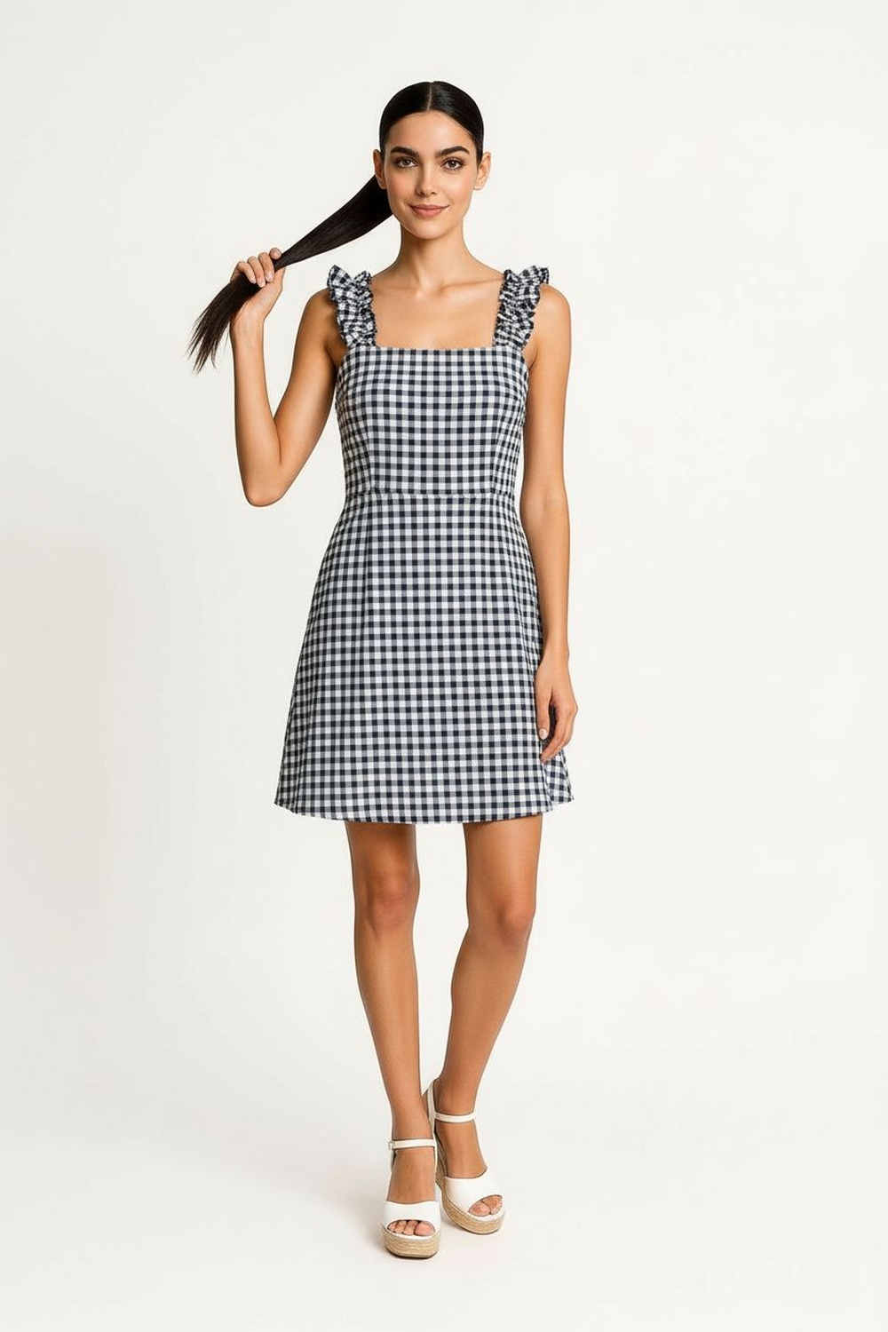 Vestido corto con tirantes, escote recto, panel superior con smock, ajuste al torso, falda con caída ligera, corte por encima de la rodilla