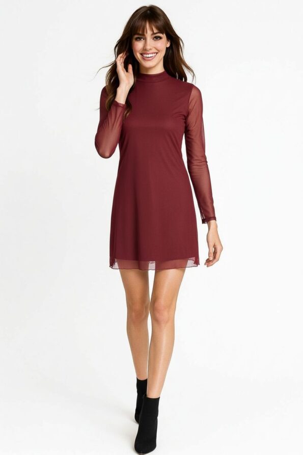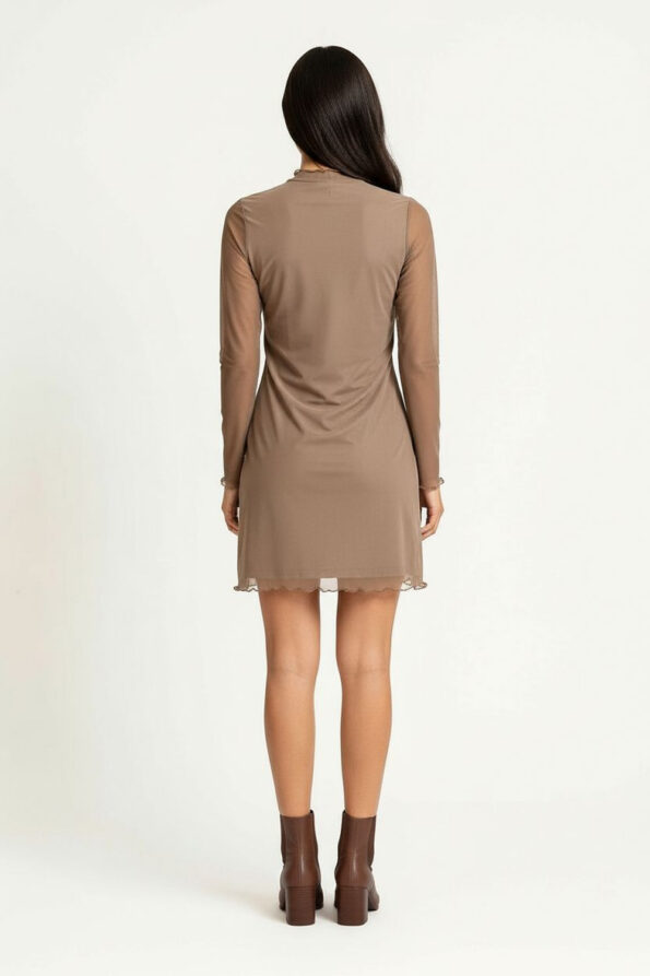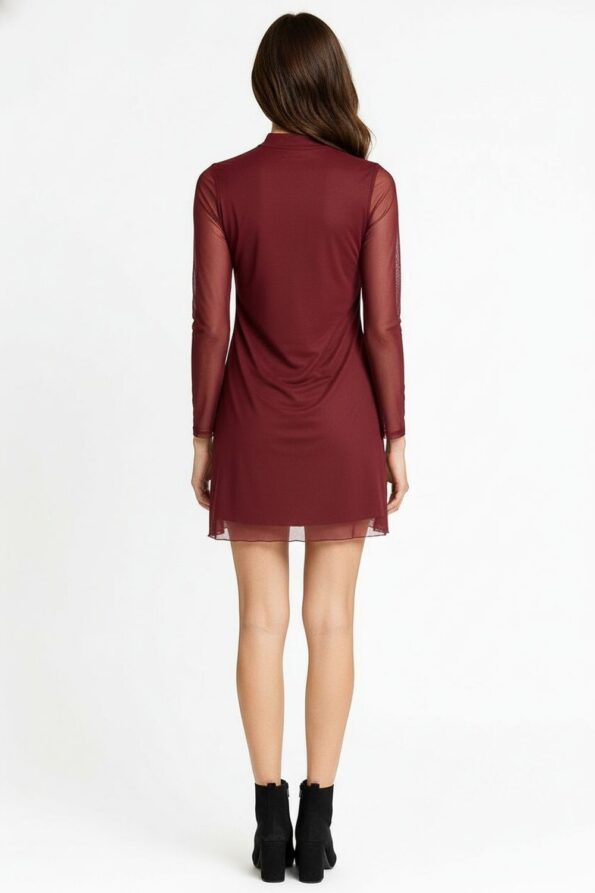Vestido de mesh con cuello alto que estiliza la figura y aporta elegancia, manga larga con acabado delicado que brinda un toque sofisticado, confección semitransparente con forro interior que asegura comodidad y cobertura, terminado festoneado en puños y bajo que realza el diseño con sutileza