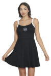 Vestido corto con tirantes delgados cruzados en espalda que brindan sujeción, busto estructurado que realza la forma, falda amplia de caída fluida que genera movimiento, cierre posterior oculto que facilita el ajuste, confección ligera de tacto suave