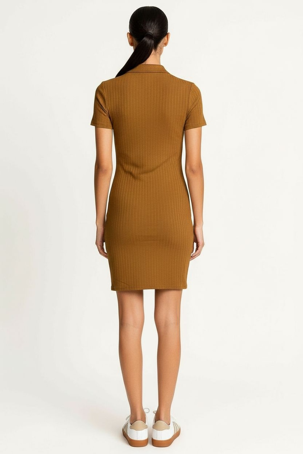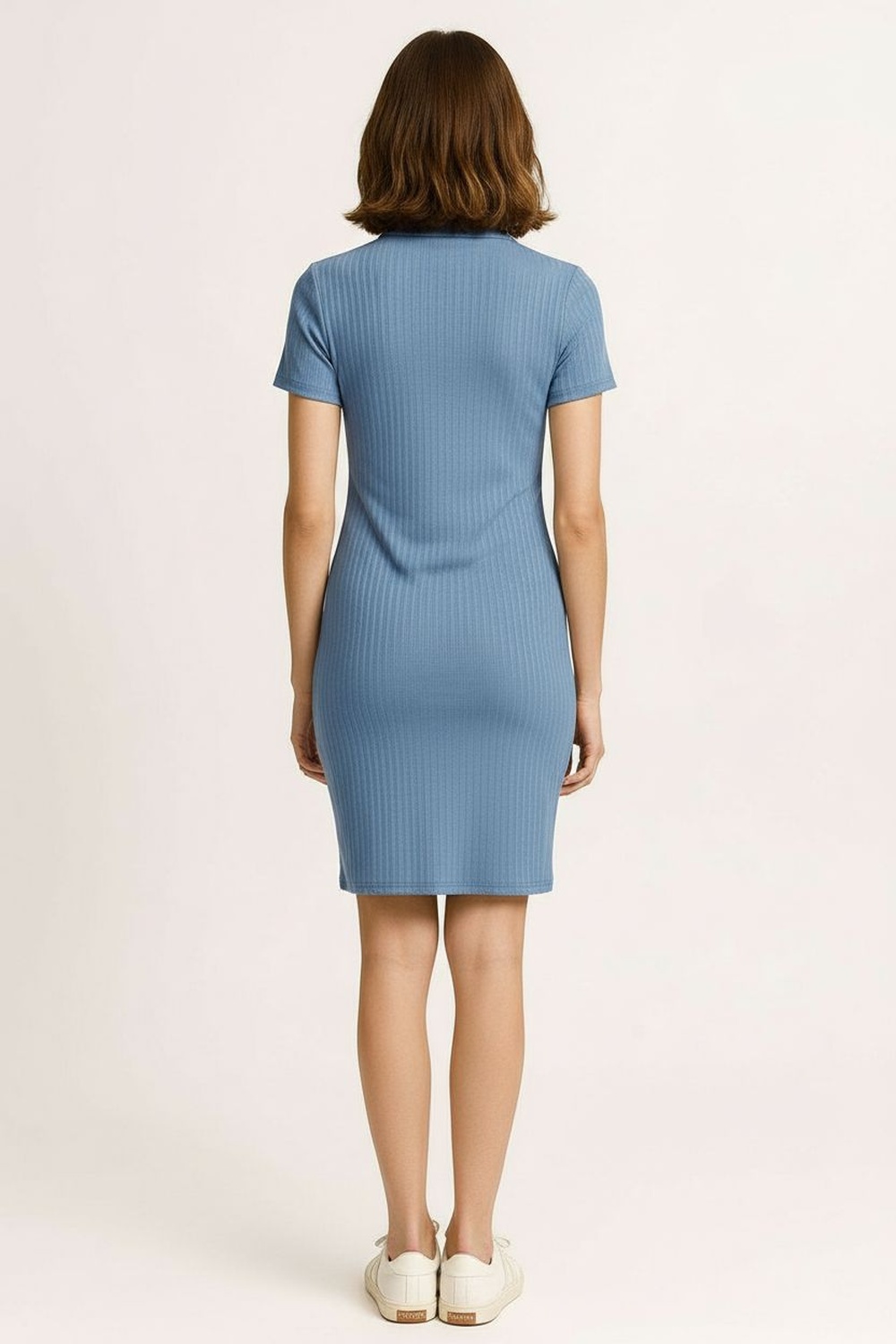 Vestido corto de manga corta con cuello tipo polo, confeccionado en tejido con textura marcada, botonadura frontal funcional, silueta recta con ajuste cómodo que acompaña el contorno del cuerpo