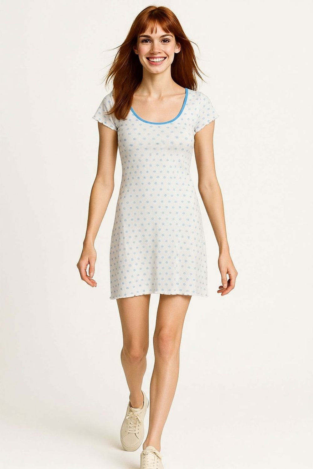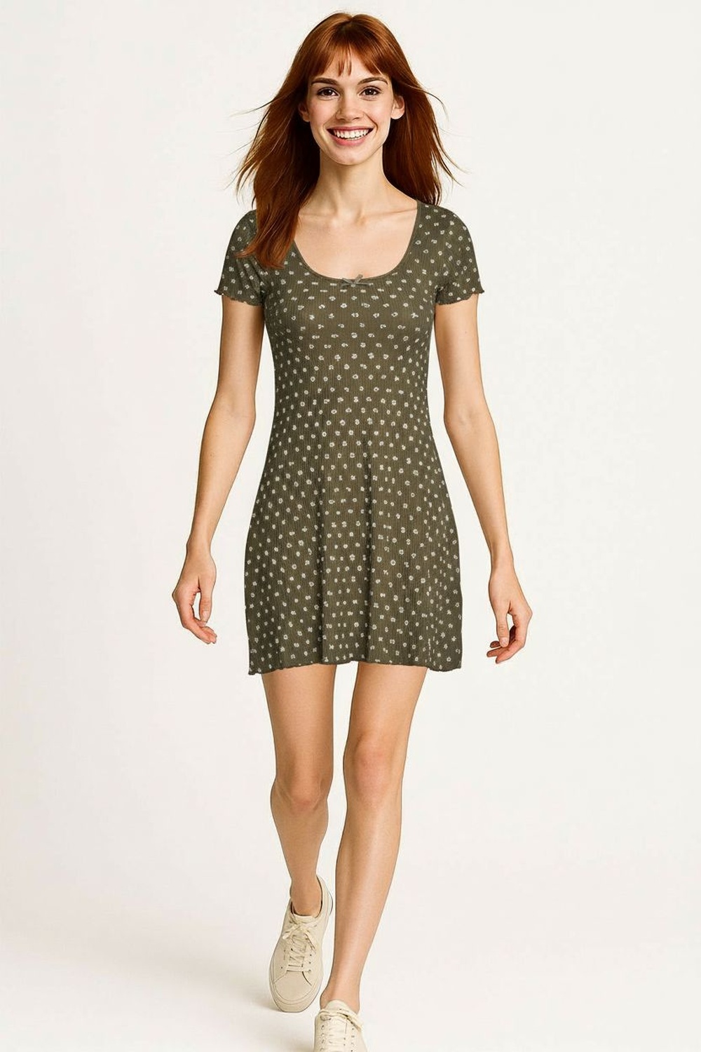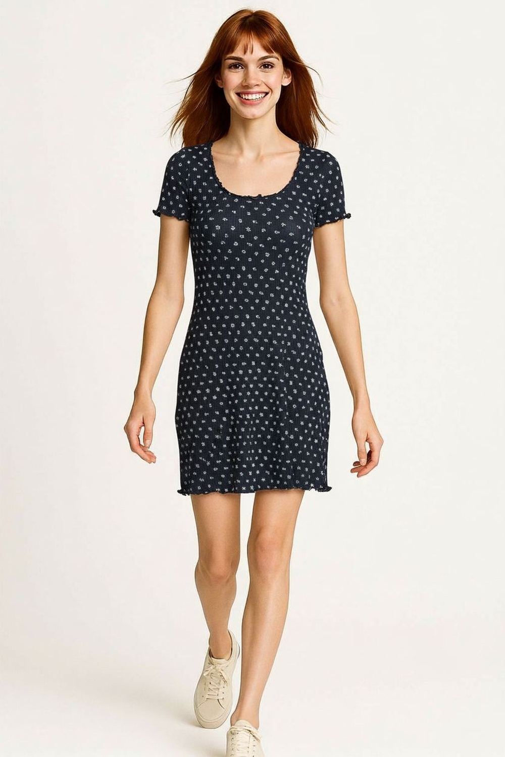 Vestido rib manga corta, escote redondo amplio, tejido acanalado flexible, silueta corta, terminación ondulada inferior, confección cómoda