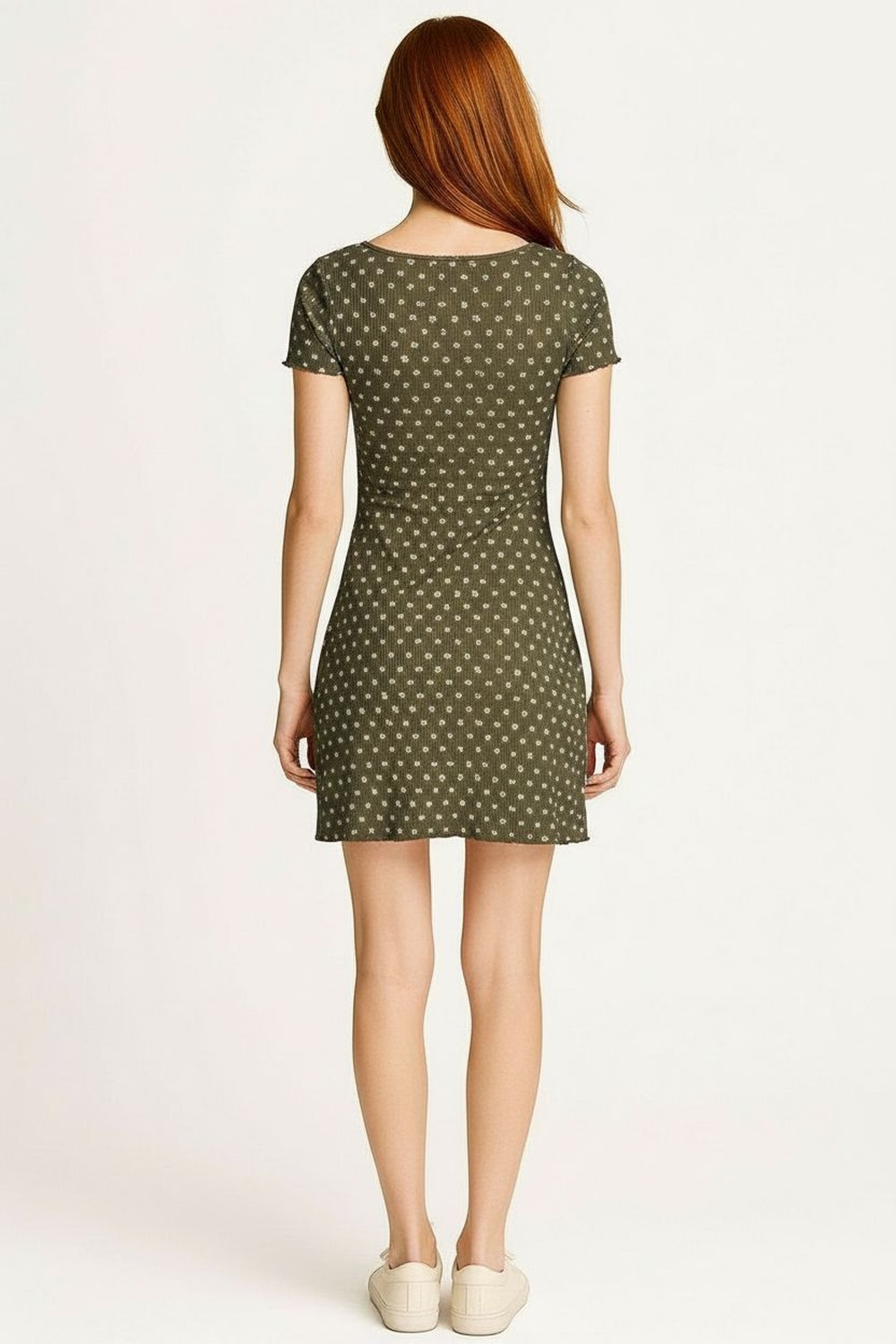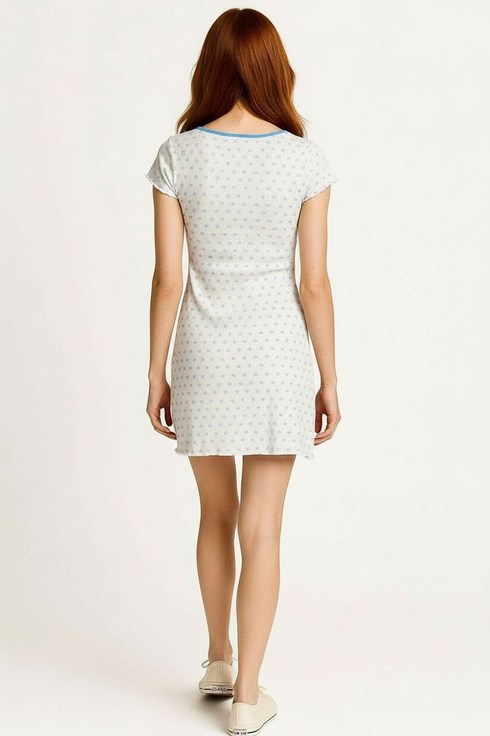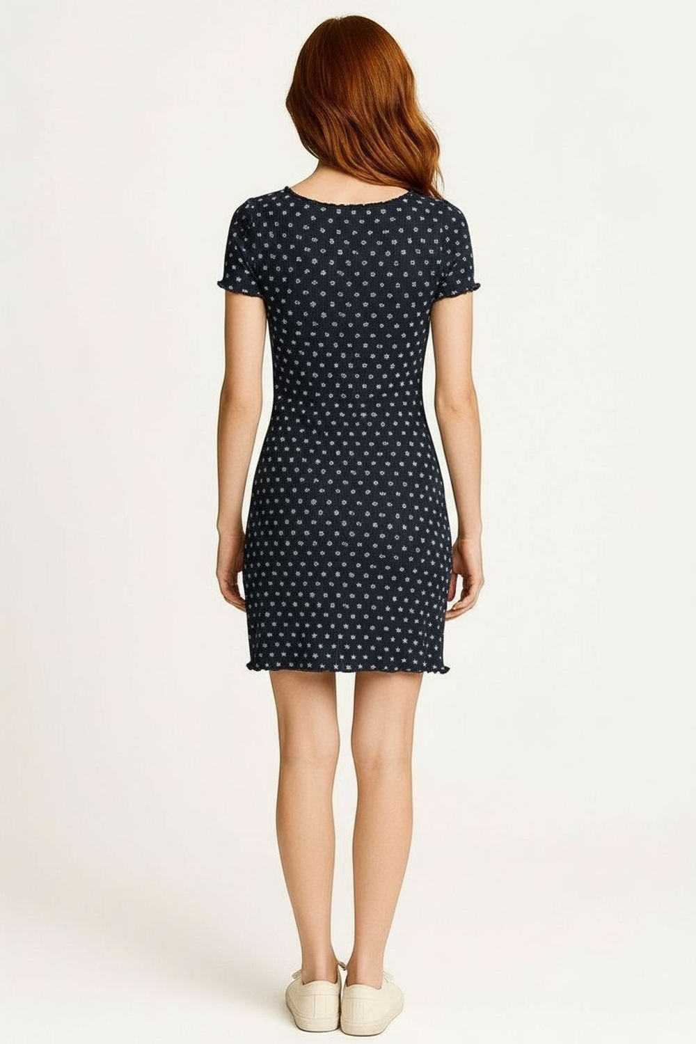 Vestido rib manga corta, escote redondo amplio, tejido acanalado flexible, silueta corta, terminación ondulada inferior, confección cómoda