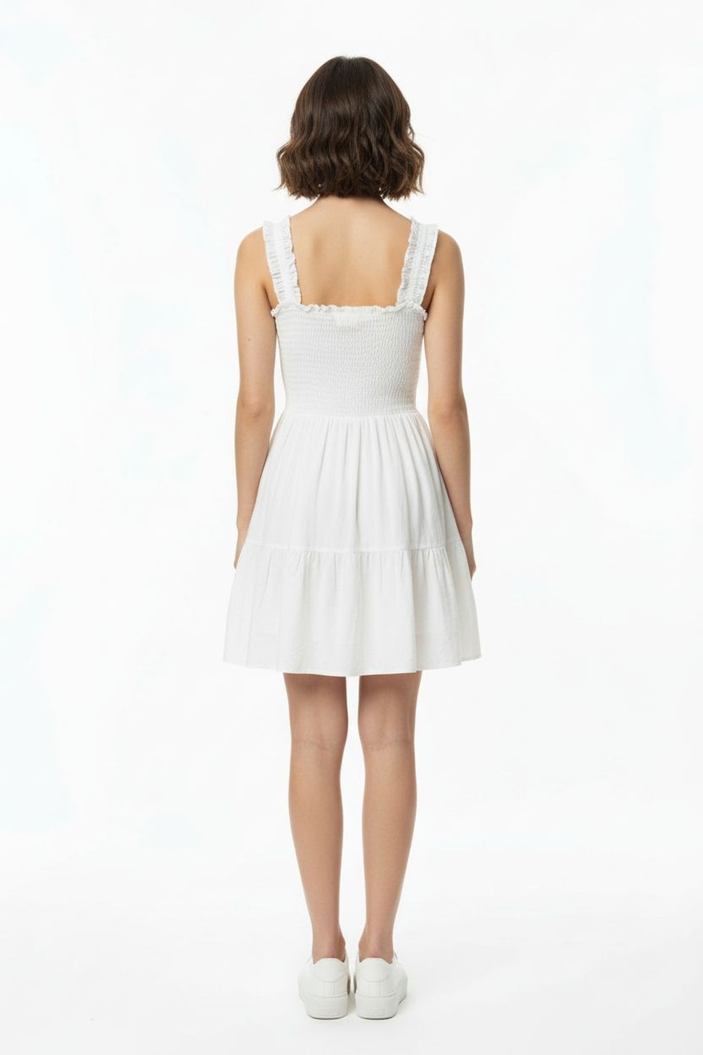 Vestido corto con escote cuadrado, tirantes con detalle, cuerpo superior con smock elástico, falda con caída ligera, ajuste cómodo al cuerpo