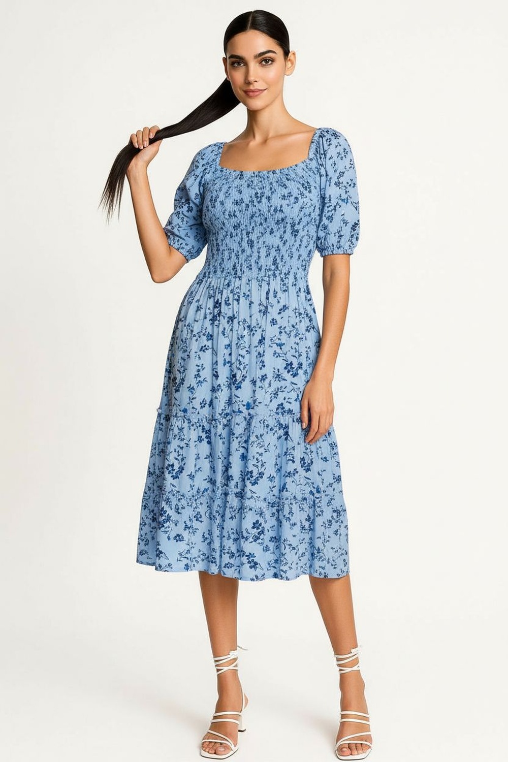 Vestido de tirantes anchos con panel superior enresortado que se ajusta al contorno y brinda soporte cómodo, escote recto que estiliza la parte superior, falda de largo midi con cortes horizontales que aportan amplitud y caída ligera, confección en tela suave de tacto agradable que permite frescura durante el día, estructura fluida que realza movimiento natural