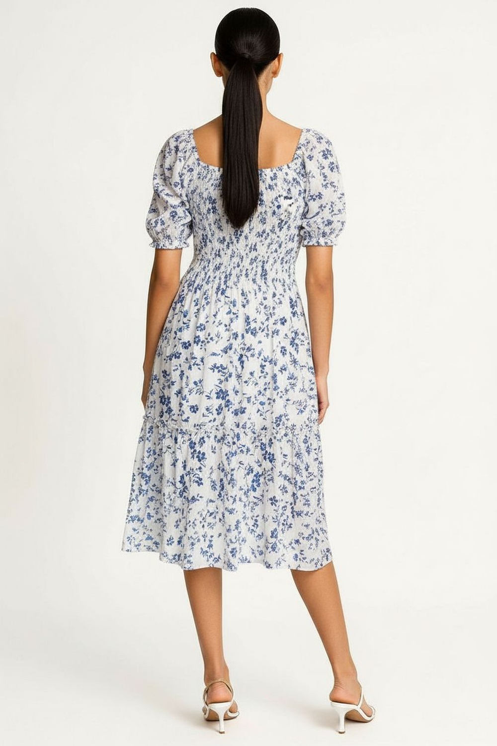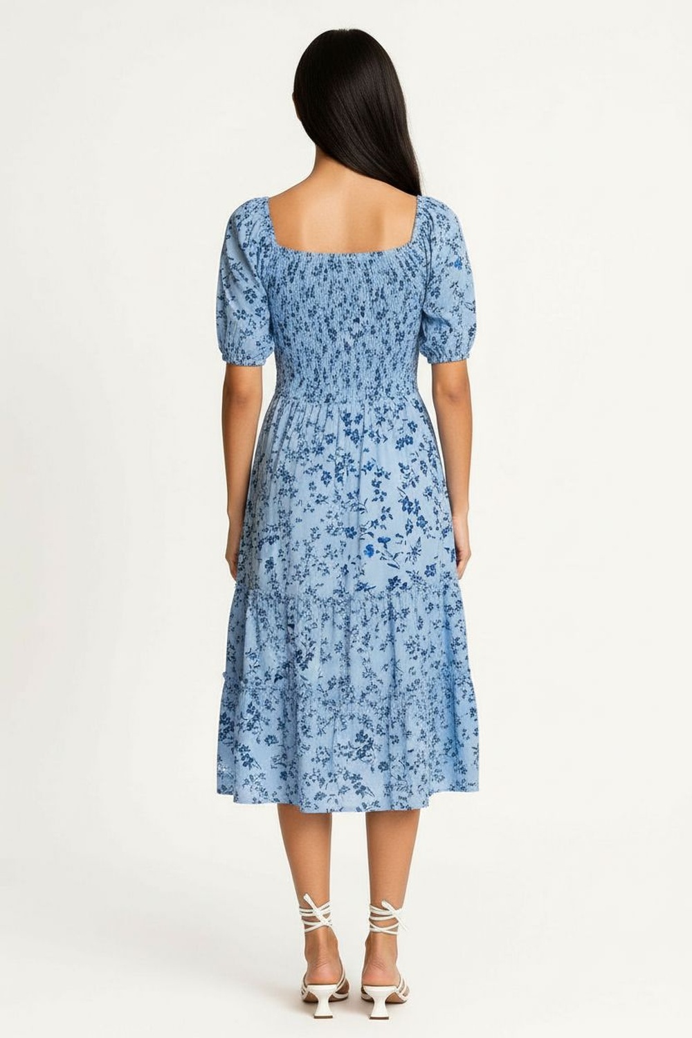Vestido corto con escote cuadrado que realza la parte superior, cuerpo con fruncido elástico que se adapta al contorno, manga corta con volumen estructurado que aporta balance, falda con caída fluida y largo arriba de la rodilla, confección ligera que brinda comodidad continua