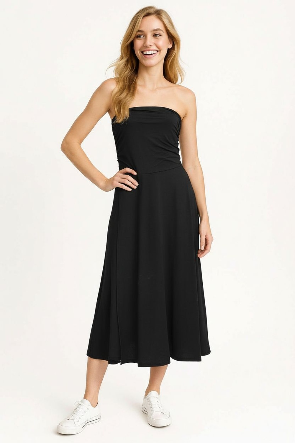 Vestido straple con confección en tejido suave de caída fluida, plizado lateral que moldea el contorno y genera efecto visual estilizado, abertura discreta que aporta comodidad y movimiento, largo midi con terminación amplia que otorga elegancia contemporánea