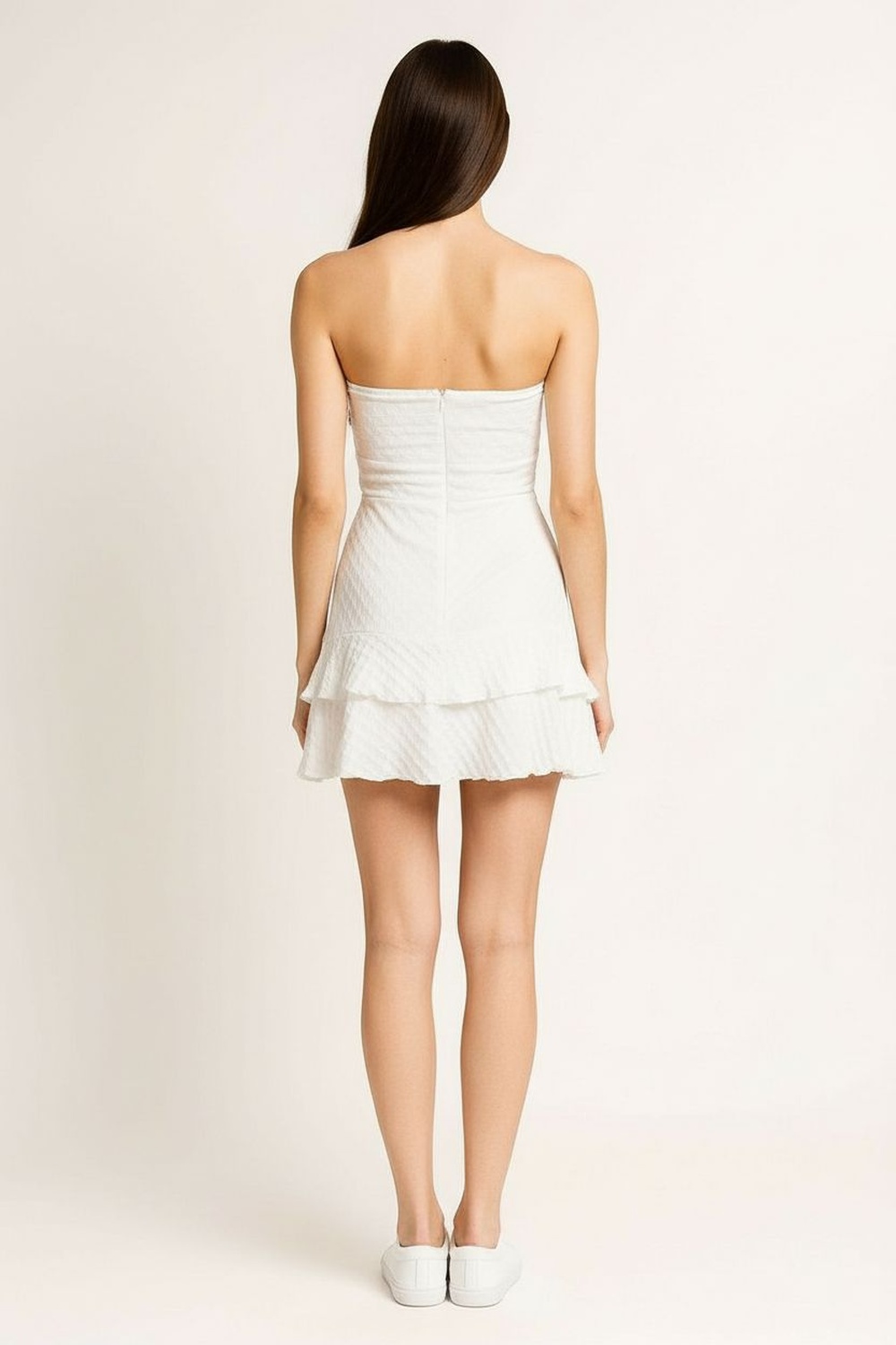 Vestido de silueta ajustada en la parte superior con caída fluida en el bajo, confección en tejido con relieve que aporta dimensión y movimiento, escote recto con tirantes delgados que brindan soporte ligero, largo corto con terminación irregular que genera dinamismo visual, estructura suave que se adapta al cuerpo manteniendo comodidad durante su uso