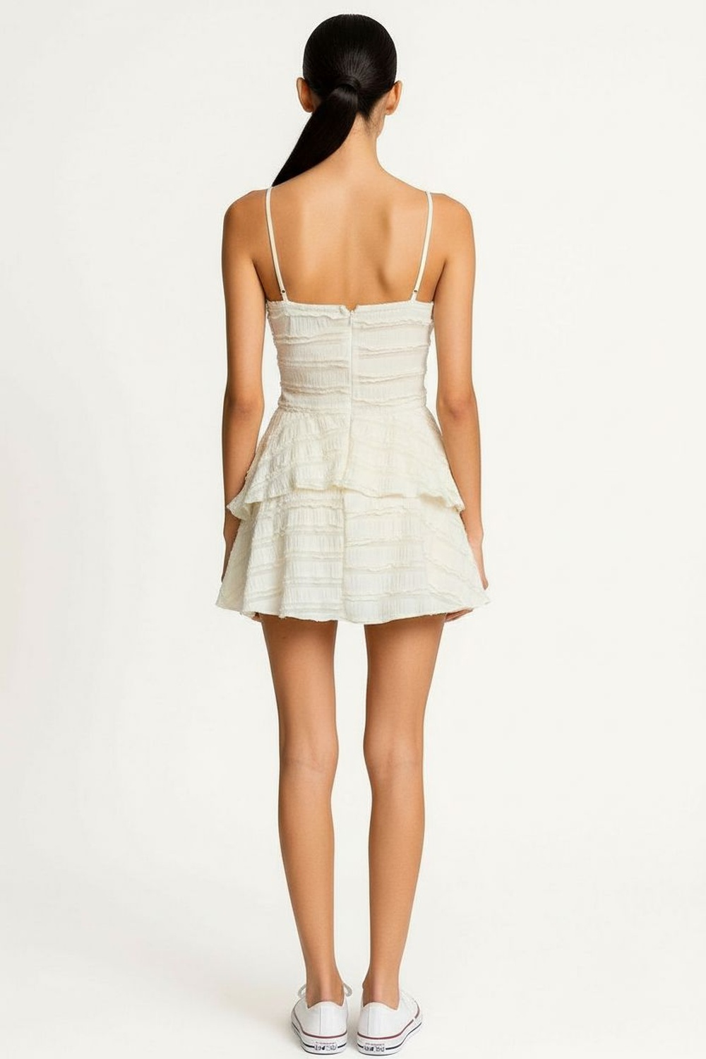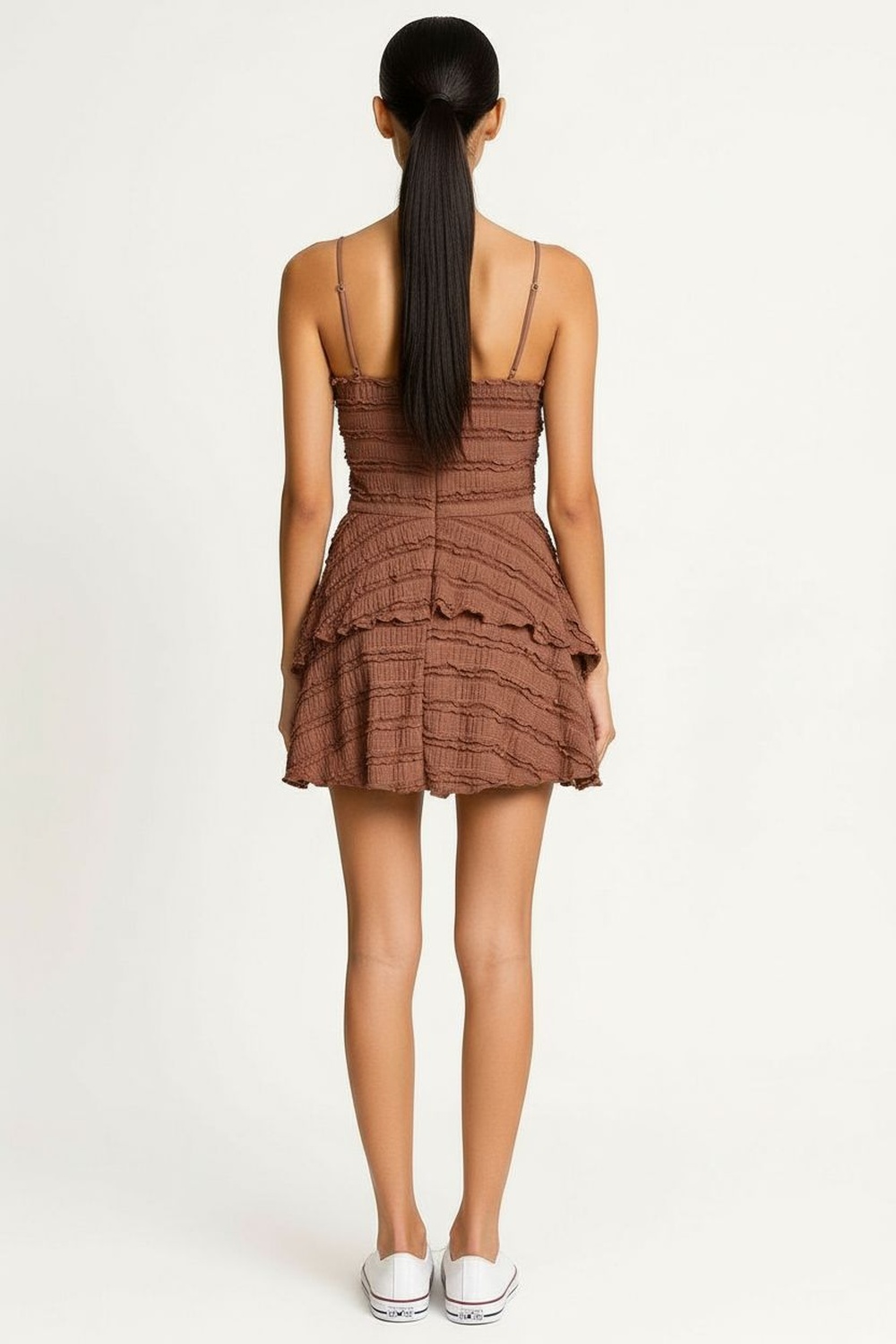 Vestido con tirantes delgados y escote pronunciado, cuerpo ajustado con textura definida, falda con capas de olanes que brindan volumen, confección ligera y cómoda